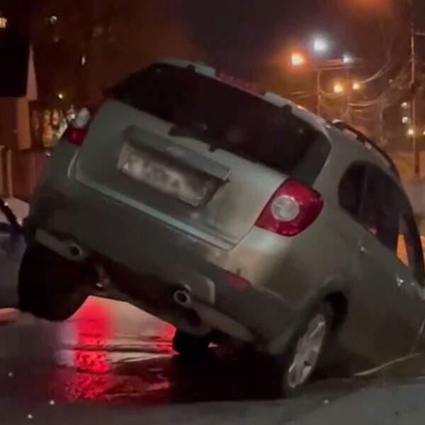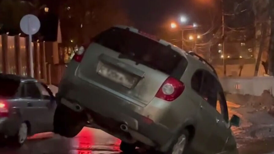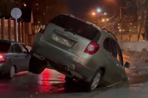 Очевидцы запечатлели инцидент на камеру. На кадрах видно, как передняя часть автомобиля провалилась в яму и застряла, при этом машина наклонена вперед таким образом, что заднее левое колесо не касается земли.