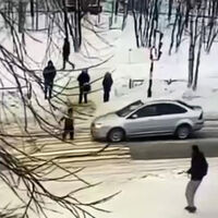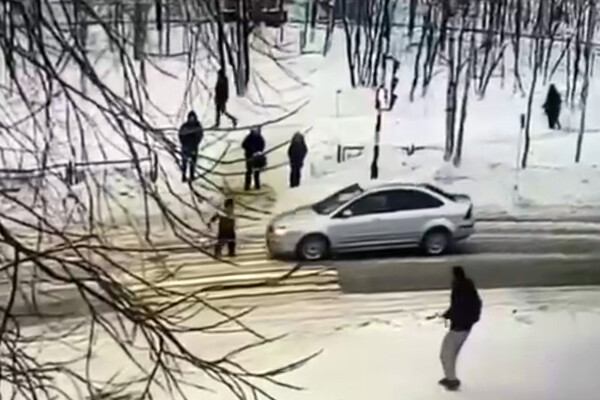 Уличная камера запечатлела инцидент. На кадрах видно, как ребенок выбегает на пешеходный переход, где его сбивает проезжающий автомобиль. От удара ребенок отлетает на несколько метров в снег. После этого к нему подбегают люди.