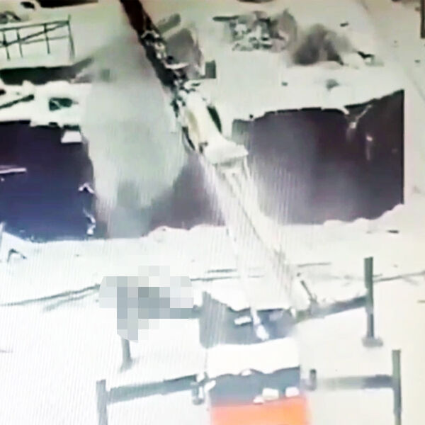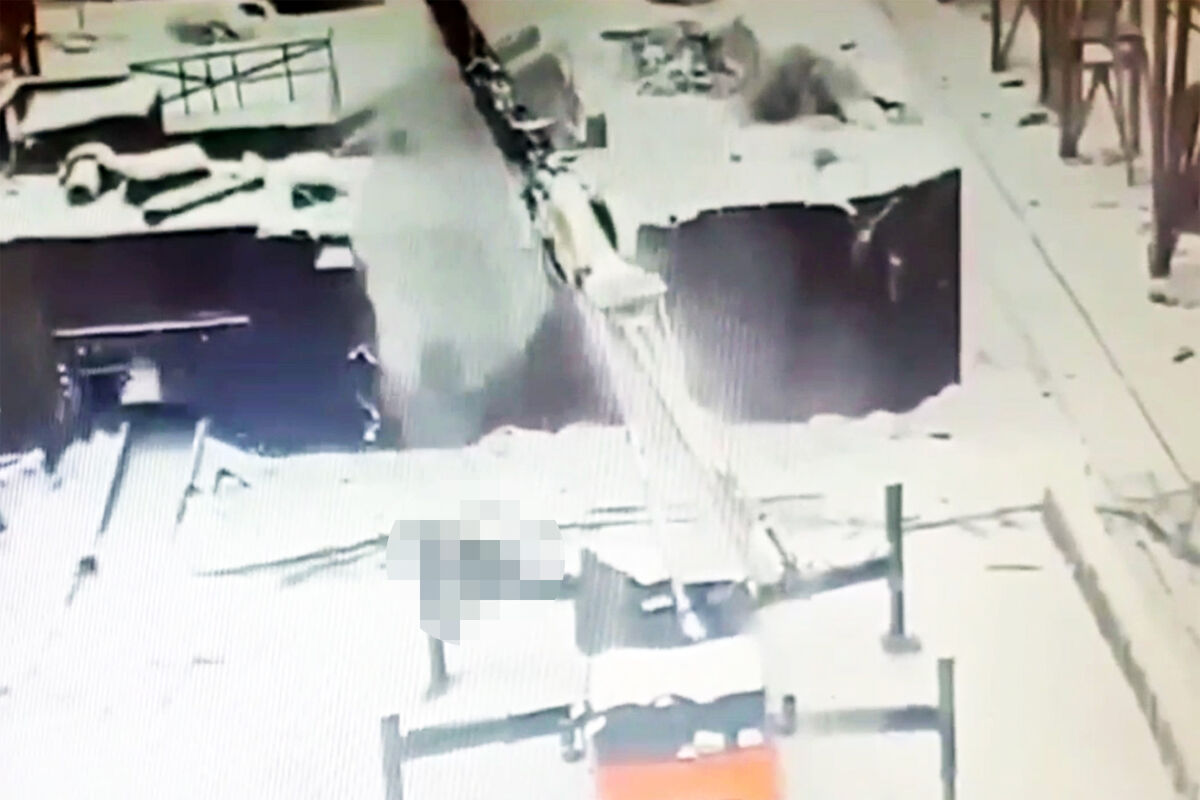 Инцидент запечатлела уличная камера. На кадрах видно, как кран опускается, и сверху падает рабочая платформа с человеком.