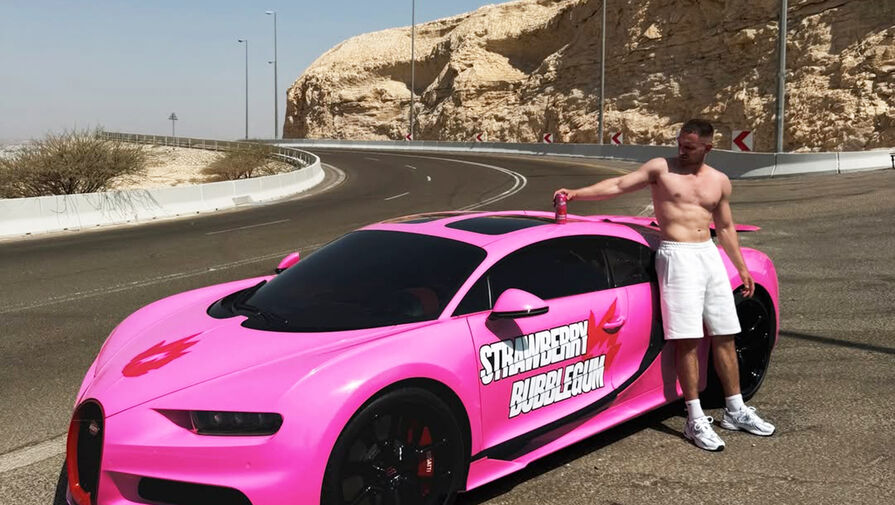На опубликованных в сети фотографиях видно, что мужчина стоит в белых шортах и кроссовках на фоне розового автомобиля Bugatti Veyron. Также заметно, что мужчина держит рукой банку, которая стоит на крыше машины.