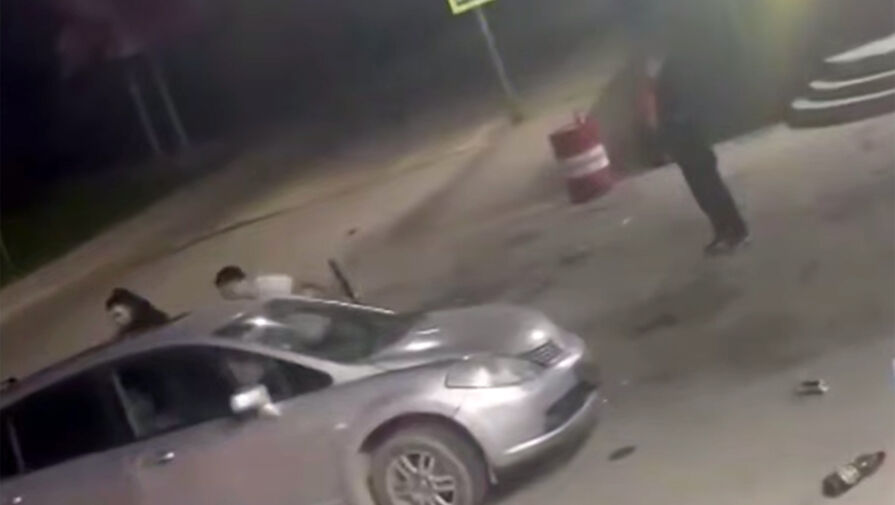 Уличная камера запечатлела инцидент на видео. На кадрах видно, как мужчина падает на проезжую часть, и в этот момент на него наезжает легковой автомобиль, который еще несколько метров тащит человека. Далее на записи видно, как нарушитель размахивает ножом.
