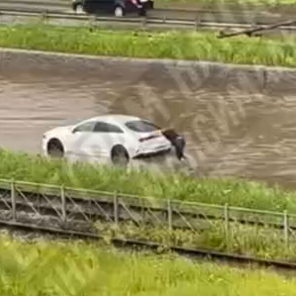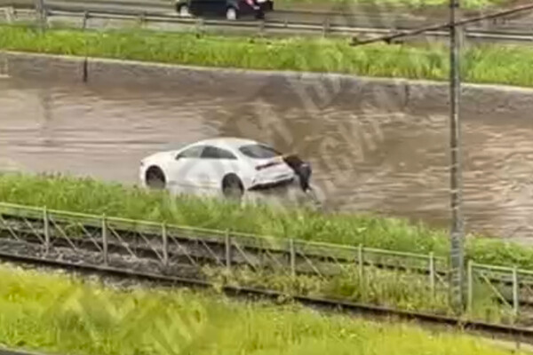 На размещенных кадрах видно, как улицу затопило водой. В результате движение по трассе оказалось затруднено — водителям приходится «плыть» по большой луже и толкать машину сзади.
