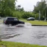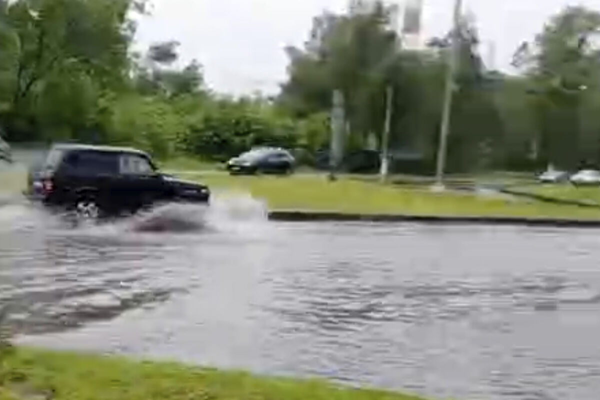 На размещенных кадрах видно, что машинам приходится двигаться по «волнам» в большой луже, которая образовалась после дождя с грозой.
