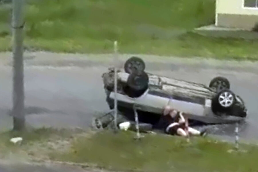 Уличная камера запечатлела инцидент. На кадрах видно, как автомобиль врезается в столб и переворачивается на крышу. После произошедшего водитель выбирается из поврежденной машины и уходит.