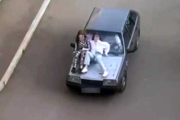 На опубликованных в сети кадрах видно, как две девушки сидят на капоте автомобиля Lada, который движется по проезжей части.