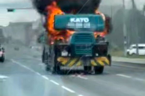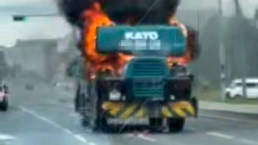 Mash: автокран целиком вспыхнул на оживленной дороге в Южно-Сахалинске