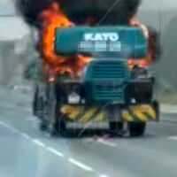 В Южно-Сахалинске автокран вспыхнул на дороге и попал на видео