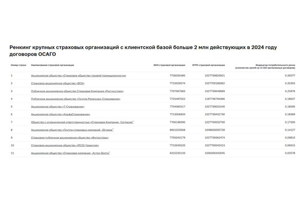 «Компании распределены по уровню индикатора потребительского риска — от большего к меньшему. Он рассчитывается как отношение количества жалоб на конкретного страховщика к каждым 10 тыс. заключенных им договоров», — говорится в сообщении Банка.