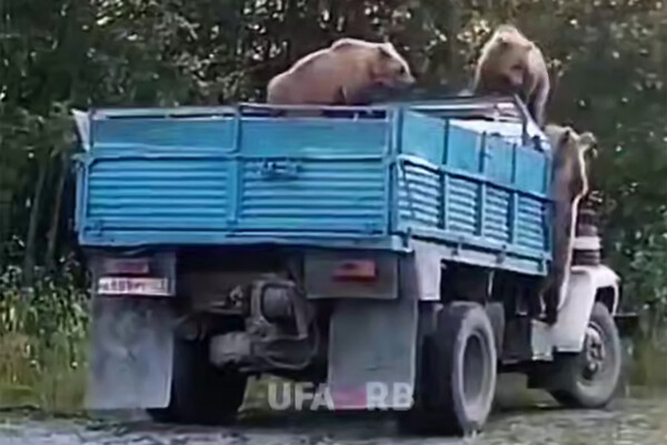 Очевидцы запечатлели инцидент на видео. На кадрах видно, как три медведя лазают по припаркованному грузовику, при этом рядом проезжает автомобиль.