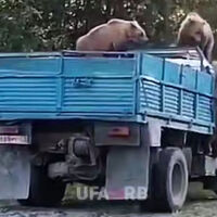 В городе Межгорье республики Башкортостан медведи забрались на грузовик. Об этом сообщает Telegram-канал «Башкирия Online».