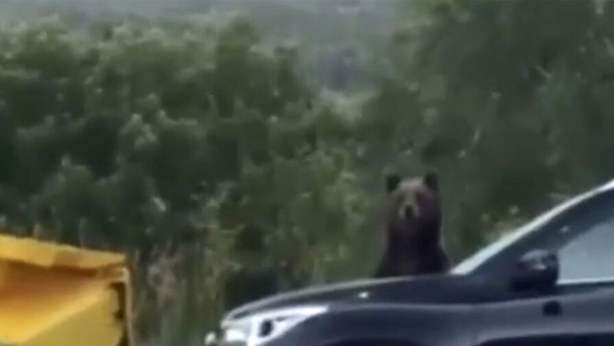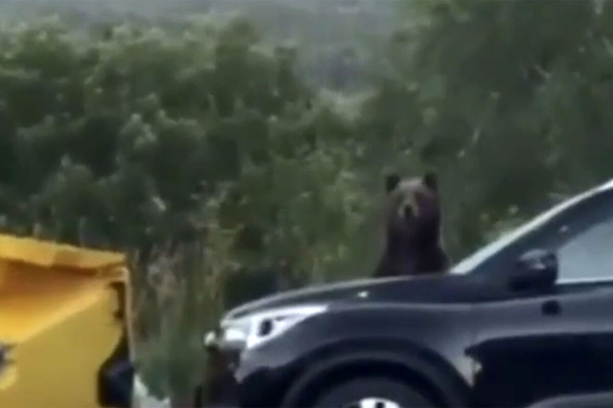 Очевидцы запечатлели инцидент на видео. На кадрах видно, как медведь несколько раз выглядывает, сидя за черным припаркованным автомобилем. При это рядом с хищником лежит перевернутый мусорный бак.