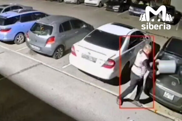 На кадрах с уличной камеры видно, как мужчина с ведром разбивает две припаркованные иномарки, после чего пытается повредить двери.