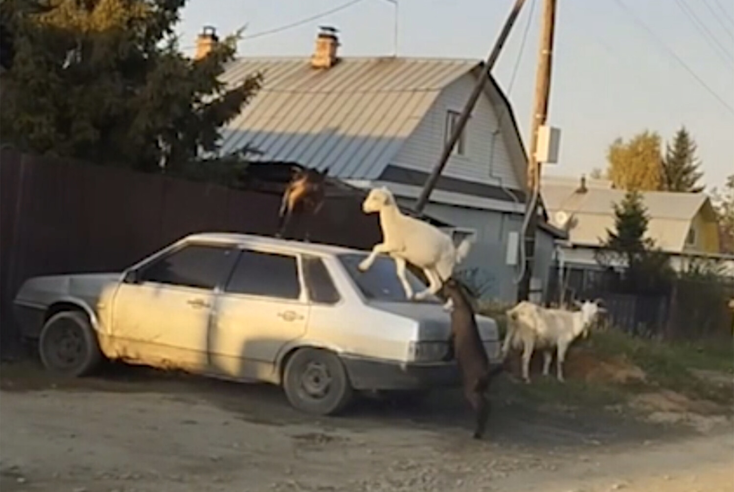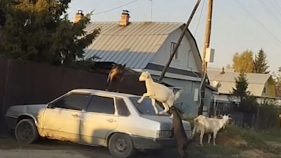 На опубликованных в сети кадрах видно, как несколько коз прыгают по крыше и багажнику припаркованной легковой машины. На кадрах также заметно, как животные бодаются.
