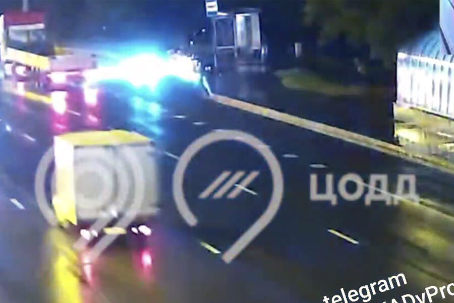 Уличная камера запечатлела инцидент. На кадрах видно, как легковой автомобиль выезжает на соседнюю полосу движения, где в него врезается большегруз. После удара машина съезжает с дороги и переворачивается, а водитель грузовика останавливает свой транспорт.