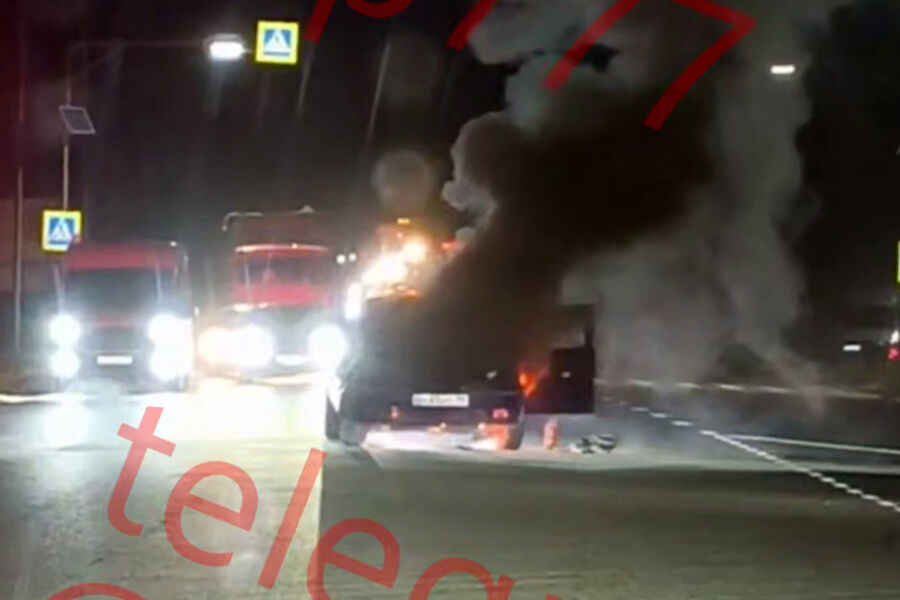 На кадрах видно, что от стоящего посреди проезжей части автомобиля поднимается густое облако дыма, а из салона вырываются языки пламени. Рядом с автомобилем находится мужчина, который пытается сбить пламя из огнетушителя. Движение рядом с пожаром не перекрыто, мимо горящей машины проезжают другие автомобили.