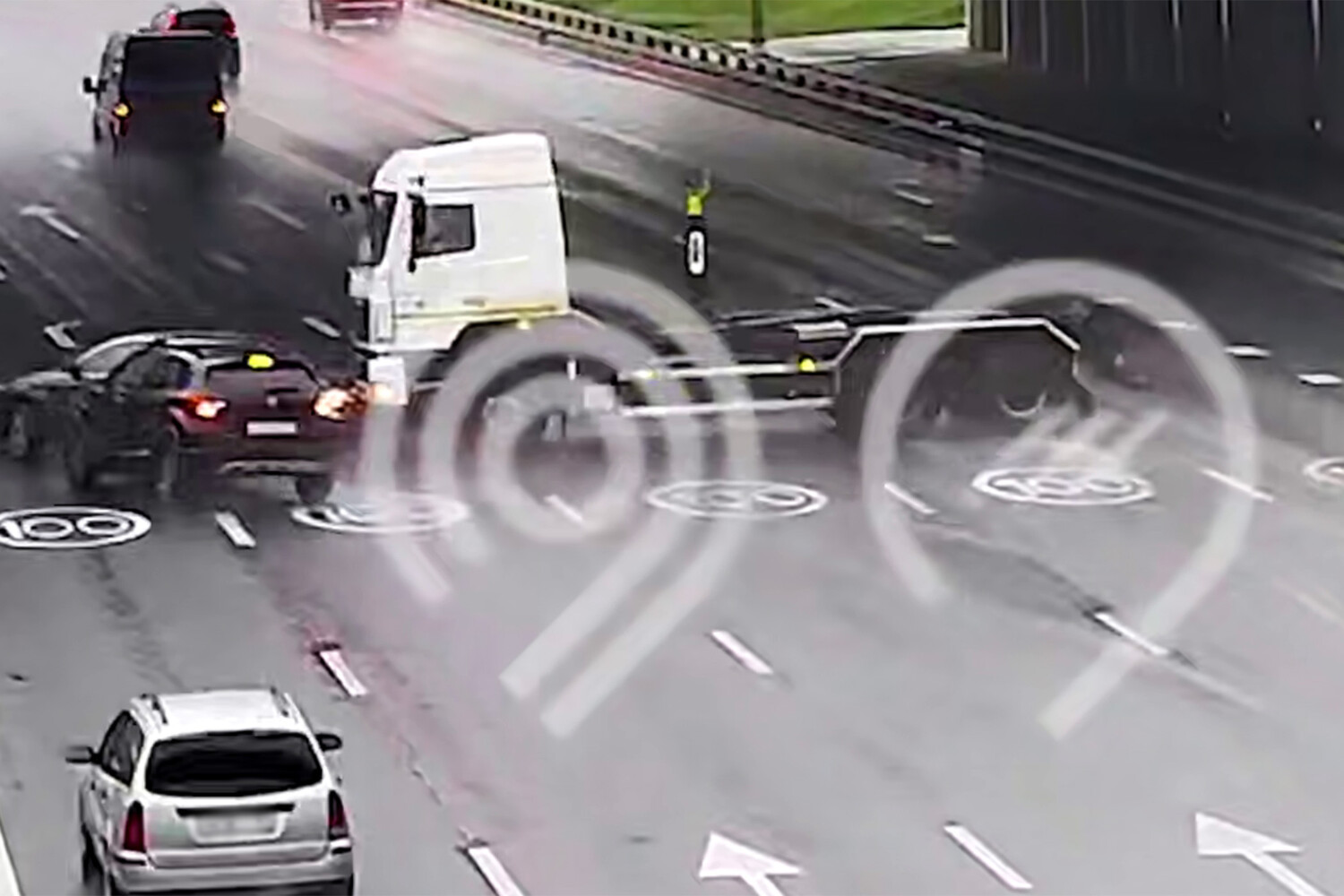 Авария произошла 21 августа на 75-м километре МКАД. На кадрах с камер наблюдения видно, что большегрузный автомобиль, оборудованный устройством «мультилифт» для перевозки сменных кузовов, движется во втором ряду на высокой скорости. Его водитель включил левый поворот и попытался перестроиться, а затем затормозил.