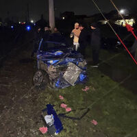 На фото с места происшествия, опубликованных ведомством, виден поврежденный автомобиль синего цвета: его передняя часть сильно деформирована — щит, стойки и крылья расплющены.