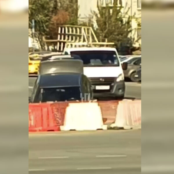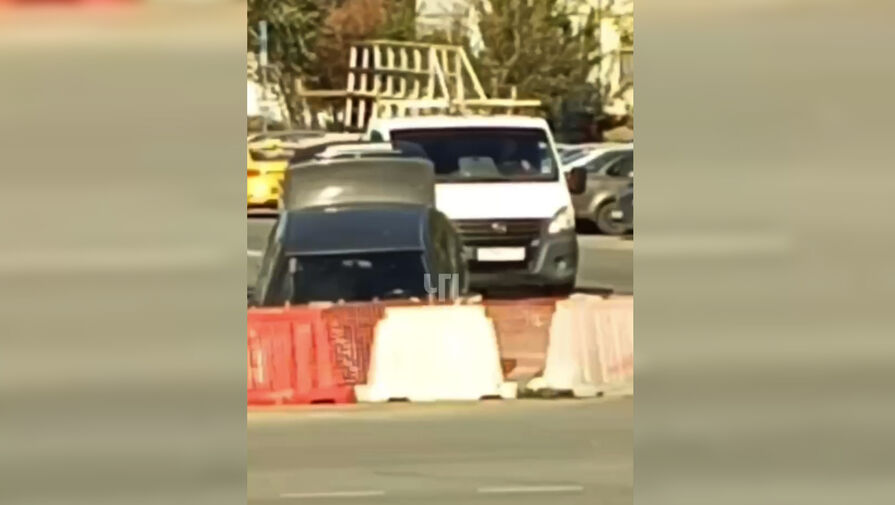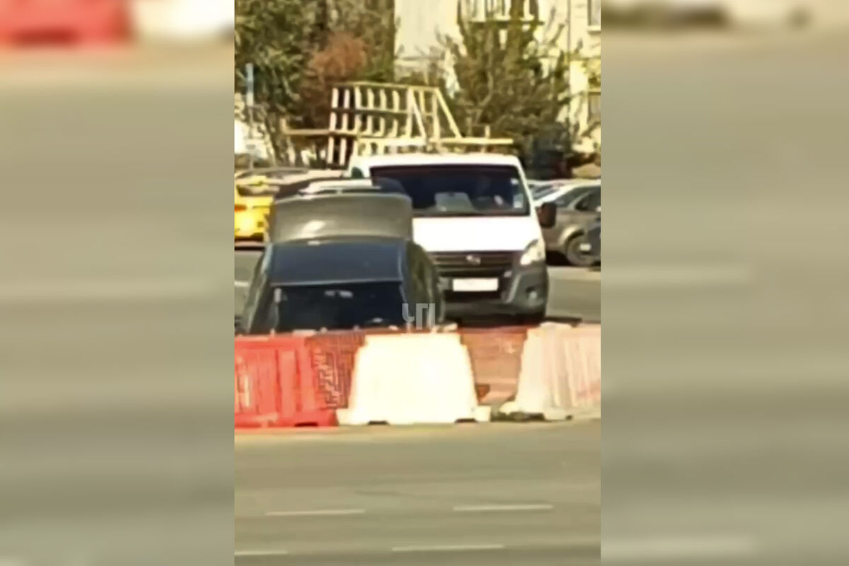 Очевидцы запечатлели последствия ДТП. На кадрах видно, что передняя часть автомобиля находится в яме, при этом возле — стоят дорожные ограждения.