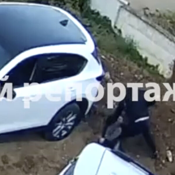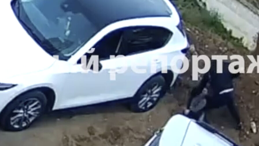 Уличная камера запечатлела инцидент. На кадрах видно, как нарушитель избивает автомобилиста возле белой машины. В момент конфликта водитель падает.