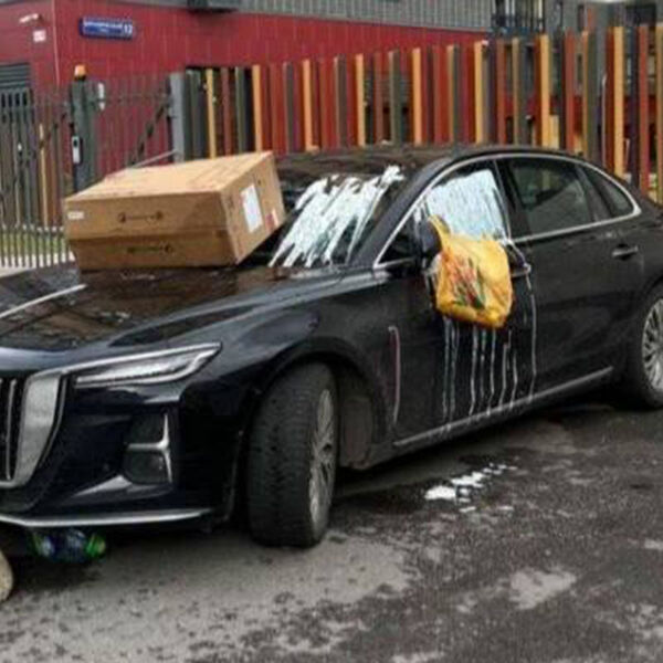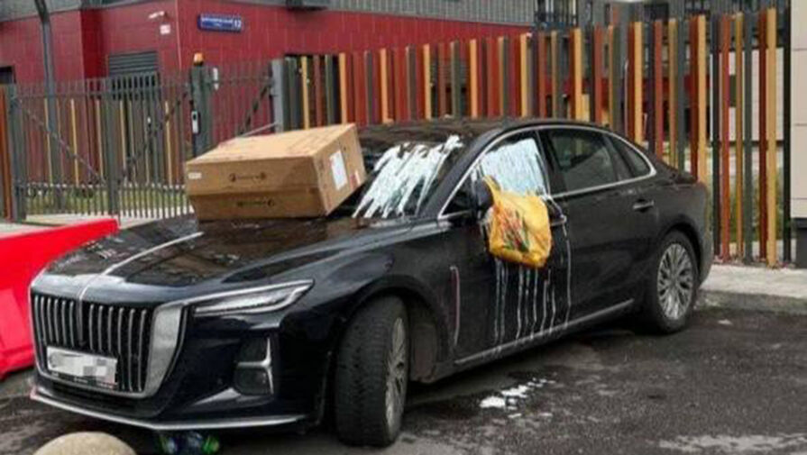 На опубликованных в сети кадрах видно, что на припаркованной иномарке лежит мусор: на капоте – коробка, к фарам привязан пакет, а также нарушители облили транспорт белой жидкостью.