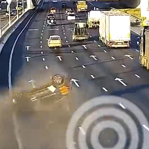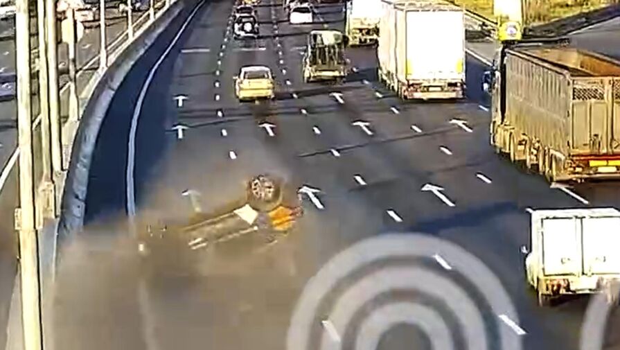 На МКАД водитель каршерингового автомобиля врезался в отбойник, а затем дважды перевернулся и попал под небольшой грузовик. Видеозапись инцидента опубликовал Telegram-канал «СпецДорПроект».