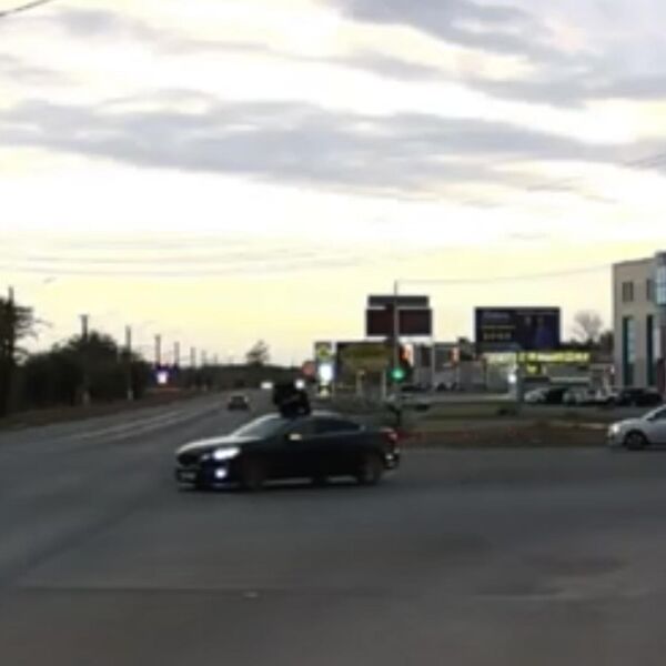 На кадрах с автомобильного видеорегистратора видно, что к перекрестку подъезжает автомобиль Mazda, на крыше которого сидит человек. Дождавшись включения зеленого сигнала светофора, водитель автомобиля с пассажиром на крыше поворачивает налево и продолжает движение. Пассажир на крыше при этом помахал рукой окружающим.