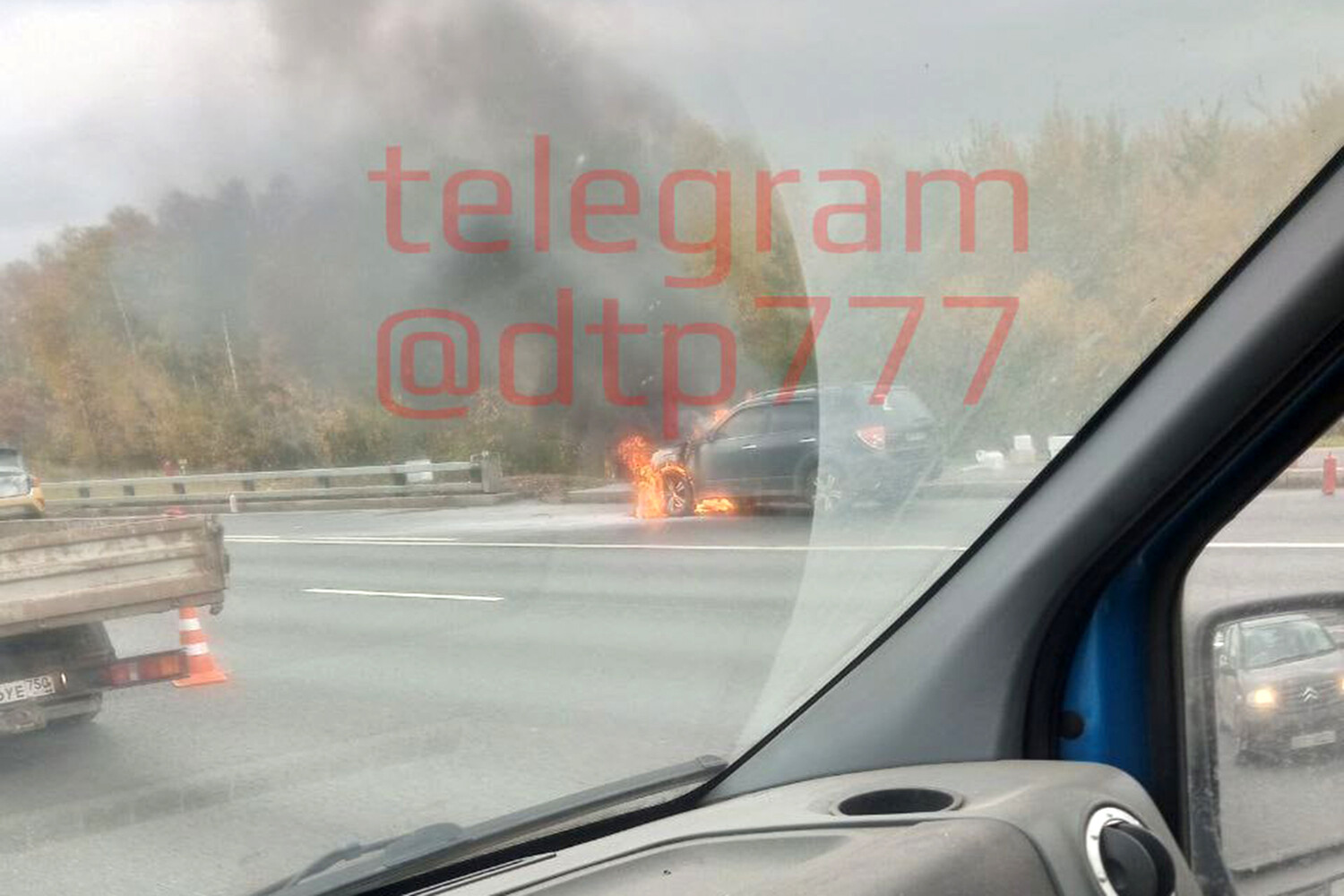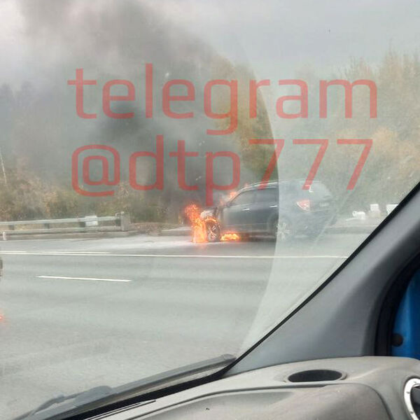 На фото с места происшествия виден кроссовер Subaru Forester, стоящий у края дороги. Его моторный отсек охвачен пламенем. Рядом видны следы порошка от огнетушителя, однако погасить им пламя не удалось. Огонь распространился на днище машины и охватил левое переднее колесо. Пламя также видно в районе лобового стекла японского автомобиля.