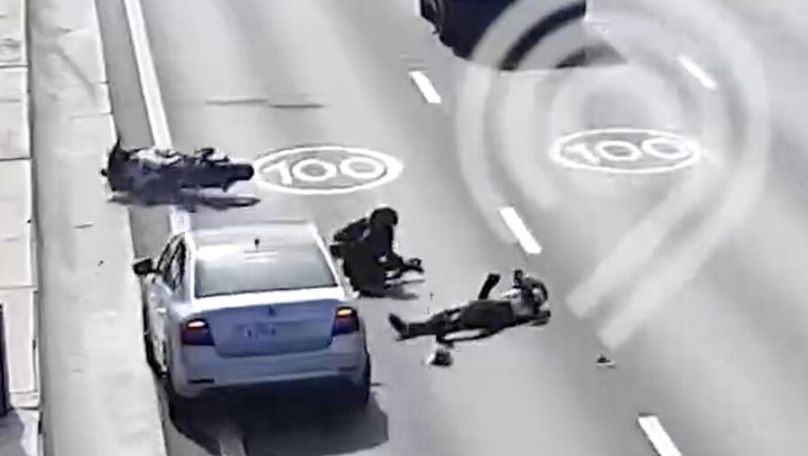 Они проскользили по инерции несколько метров и остановились. Из-под мотоцикла вырвались искры. Водитель, двигавшийся в левом ряду, смог затормозить и избежать наезда на людей.