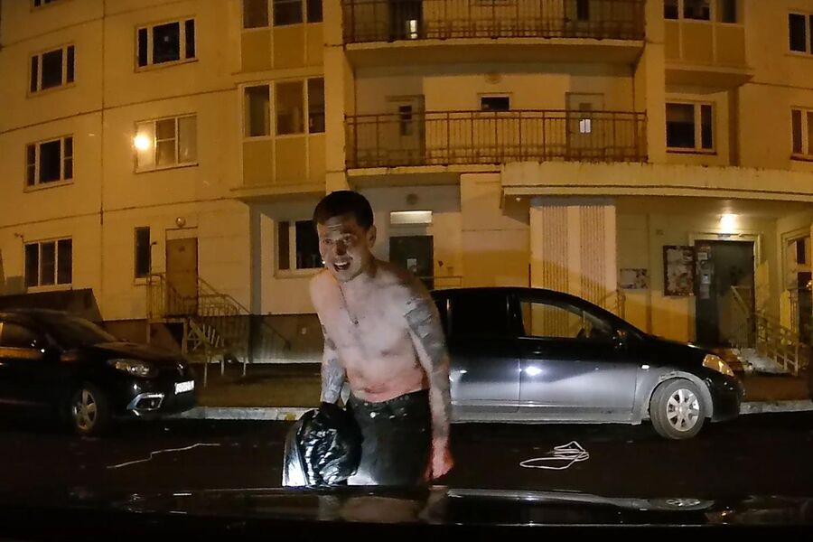 «Ночью 17.10 полуголый неадекват разбил как минимум 2 машины по адресу Фомушина, 8-1, а также набрасывался на людей. Скорей всего в мкр. Правгород разбитых машин больше», — отмечается в публикации.