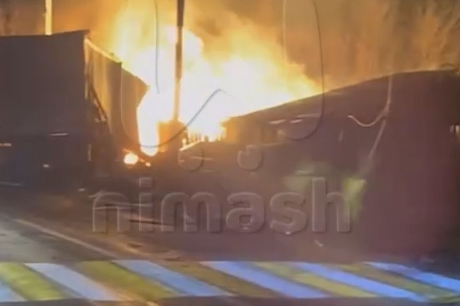 На кадрах с моментом аварии видно, что тягач с полуприцепом на высокой скорости выехал с проезжей части. Машину занесло, спустя несколько секунд вокруг нее вспыхнуло пламя.