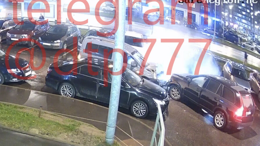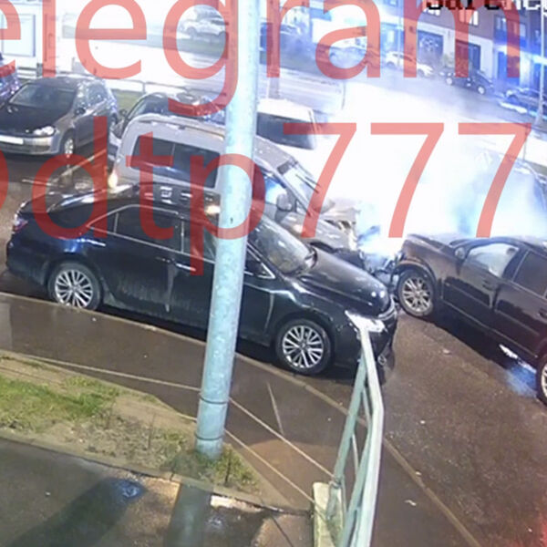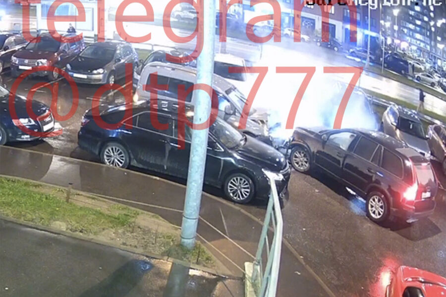 На кадрах видно, что автомобиль серого цвета двигался на высокой скорости вдоль рядов припаркованных машин. Из-за поворота появился кроссовер Volvo, произошло лобовое столкновение. От удара у серого автомобиля разбит моторный отсек, от него поднимается пар. Серьезные повреждения передней части получил и Volvo.