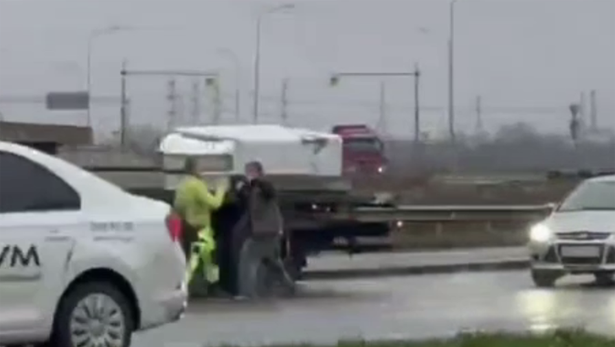 Очевидцы запечатлели инцидент на видео. На кадрах заметно, как двое мужчин дерутся на проезжей части воле припаркованного большегруза. Водители наносят друг другу удары, при этом возле конфликтующий проезжает много автомобилей.