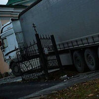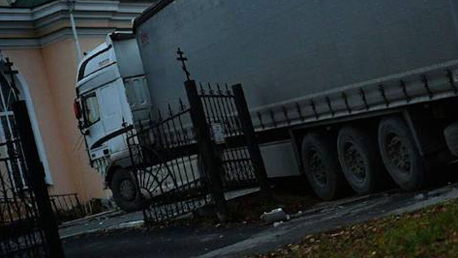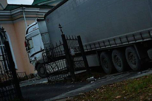 На кадрах с места происшествия видно, что большегрузный тягач с полуприцепом проломил кованую ограду рядом с воротами и остановился, не доехав до стены самого храма. На тротуаре разбросаны обломки забора.