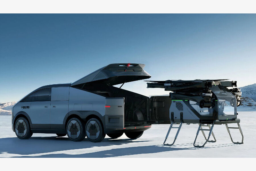 Land Aircraft Carrier — это шестиколесный электромобиль-фургон, с расположенным в задней части летательным модулем. Машина оснащена шестью винтами и управляется через мобильное приложение. Фюзеляж и лопасти изготовлены из прочного и легкого углепластика, а сам автомобиль выполняет функцию зарядной станции для летающего модуля.