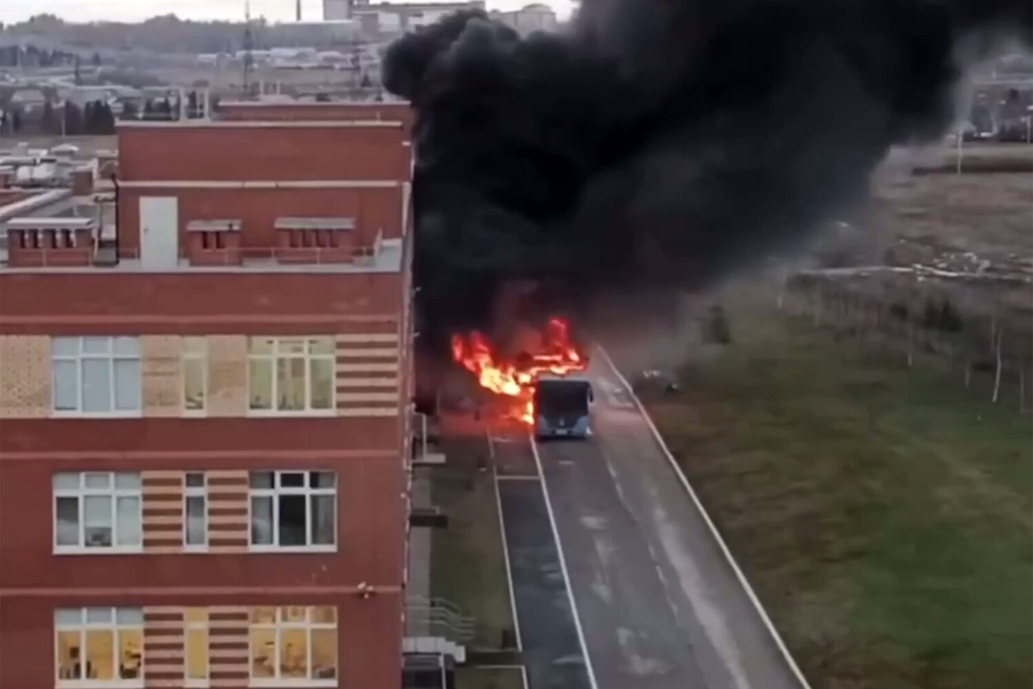 На кадрах, размещенных в сети, видно, что на проезжей части горит пассажирский транспорт, при этом пламя охватило автобус не полностью. На записи также заметно, как десятки школьников уходят дальше от места возгорания. По информации канала, в результате произошедшего никто не пострадал.