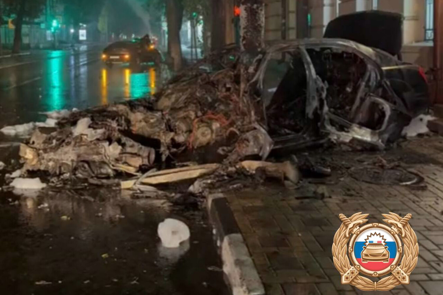 В Ростове-на-Дону черный Mercedes вспыхнул после столкновения со столбом. Об этом сообщает Telegram-канал Don Mash.
