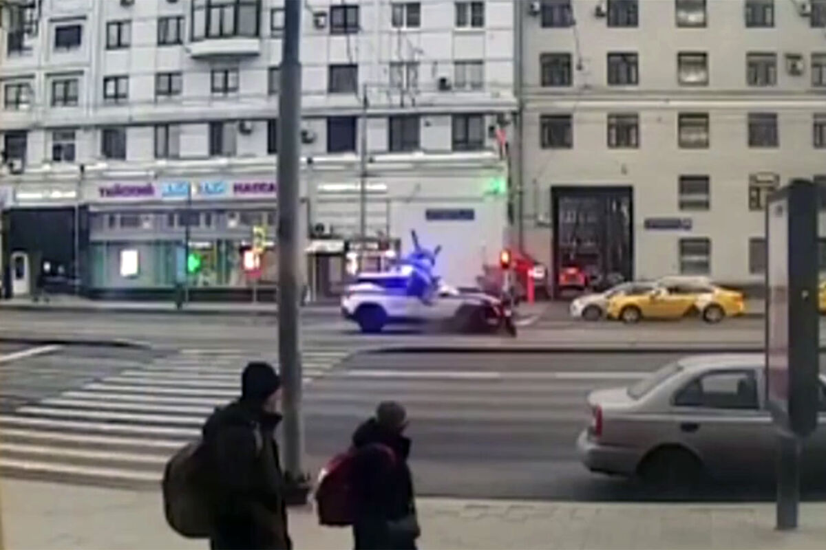 Уличная камера запечатлела инцидент. На кадрах видно, как патрульный автомобиль сбивает мужчину, который едет по пешеходному переходу. От удара человек подлетает в воздух, переворачивается и падает на проезжую часть.