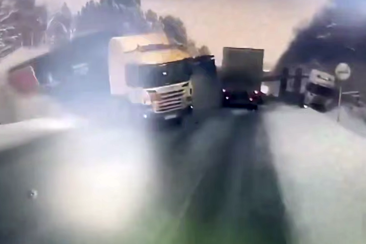 Видеорегистратор автомобиля, водитель которого стал очевидцем произошедшего, запечатлел инцидент. На кадрах видно, как одна из фур съезжает на обочину, в этот момент в нее врезается второй большегруз, который движется во встречном направлении, и фура, которая едет – в попутном.