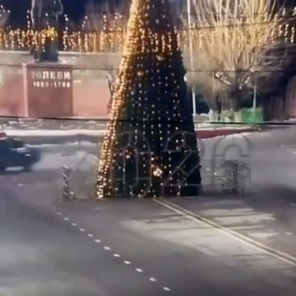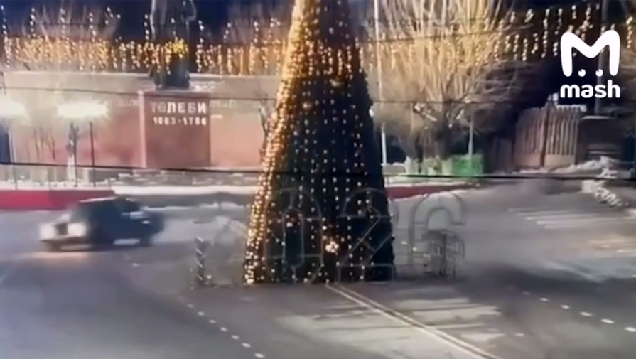 Уличная камера запечатлела инцидент. На кадрах видно, как автомобиль, выполняя опасные маневры на проезжей части, врезается в елку, которая от удара падает на землю.