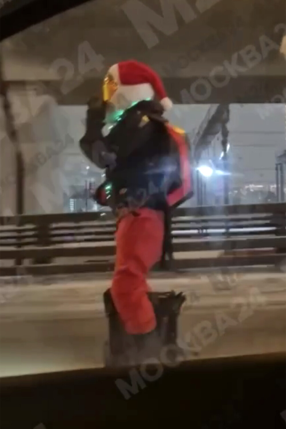 Очевидцы запечатлели инцидент. На кадрах видно, как мужчина в новогоднем костюме едет на моноколесе по проезжей части. При это заметно, что его транспорт движется с высокой скоростью.