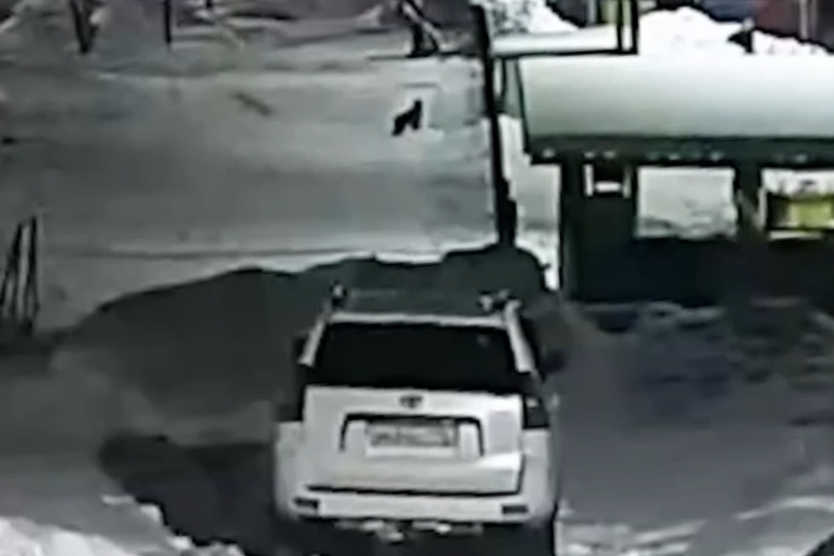 Уличная камера запечатлела инцидент. На кадрах видно, как животное бежит по заснеженной дороге, после чего обходит припаркованные автомобили.