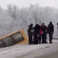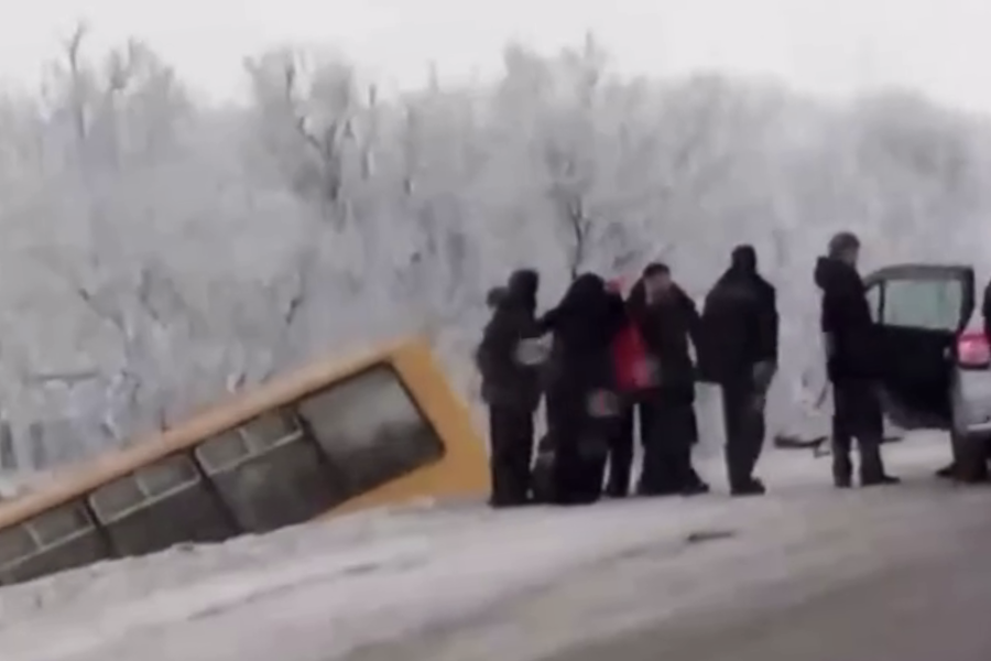 На кадрах, размещенных в сети, видно, что школьный автобус находится в кювете, при этом с другой стороны дороги горит машина. На записи также заметно, что на проезжей части разбросаны автомобильные детали, а рядом с поврежденными машинами стоят люди.