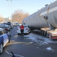 В Уфе цистерна отцепилась от фуры и упала на легковой автомобиль. Об этом сообщает Telegram-канал Mash Batash.