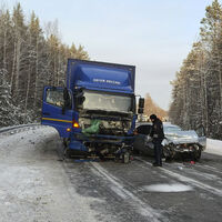 Видеорегистратор большегруза запечатлел инцидент. На кадрах видно, как иномарка выезжает на встречную полосу движения и врезается в большегруз, от удара легковой автомобиль разворачивает на скользкой дороге. Далее на записи заметно, что Kia получила серьезные повреждения: у машины смят кузов, разбит капот и бампер, при этом автомобильные детали разлетелись по проезжей части.
