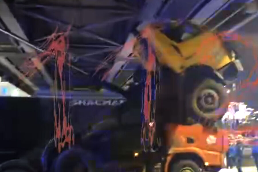На них видно, что кабина автомобиля застряла под эстакадой. Telegram-канал уточняет, что авария произошла у парка развлечений «Остров Мечты».