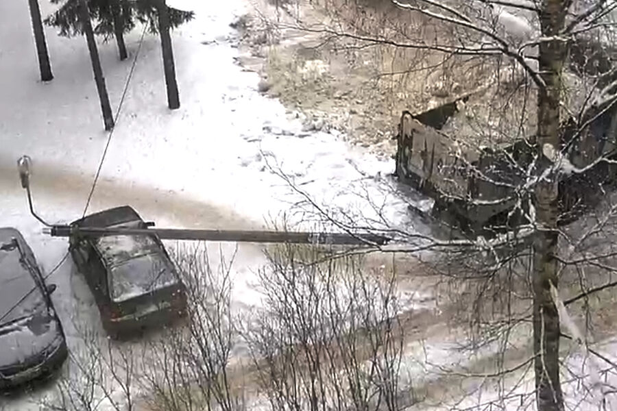 На кадрах видно, что водитель самосвала двигался задним ходом и уткнулся кузовом в железобетонный столб. От удара столб переломился и смял крышу припаркованного рядом автомобиля Lada. Удар пришелся на переднюю часть кузова, над водительским и пассажирским местами.