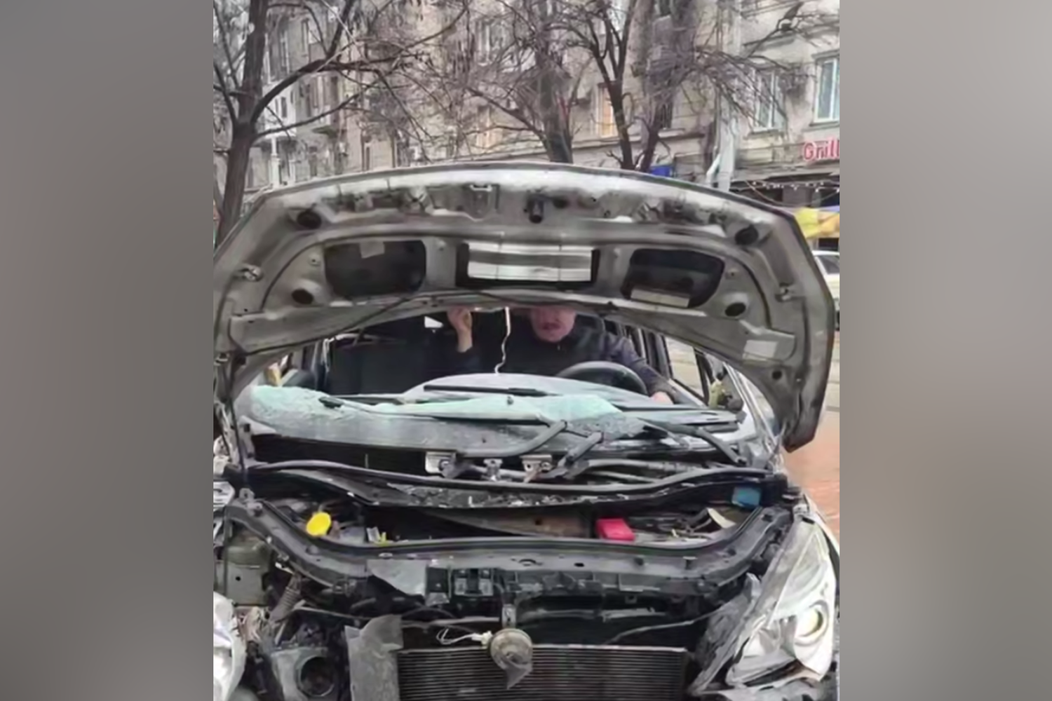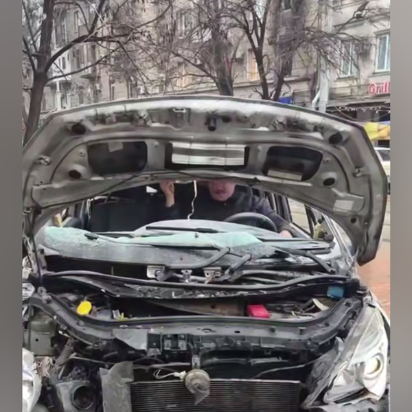 На кадрах видно, что водитель подошел к автомобилю с полностью уничтоженной передней частью, молча завел двигатель и, не сказав ни слова, уехал, сопровождаемый удивленными возгласами очевидцев.