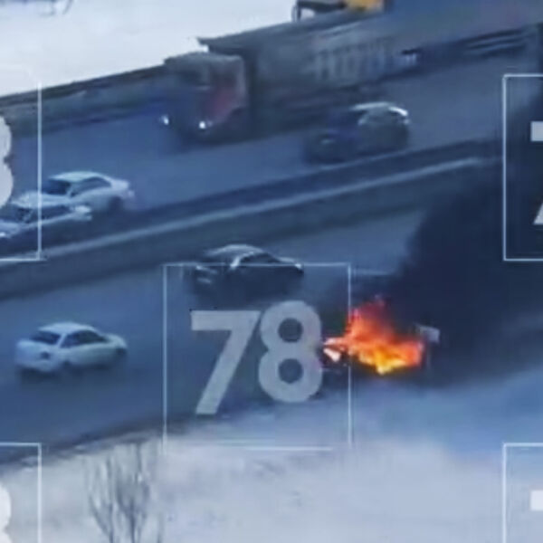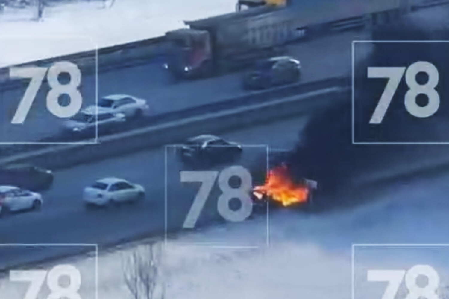 Телеканал уточняет, что огонь потушили примерно за полчаса. На кадрах с места ДТП видно, что легковой автомобиль не мешает движению и находится на полосе безопасности. Его салон охвачен огнем, а вверх поднимается столб густого черного дыма.
