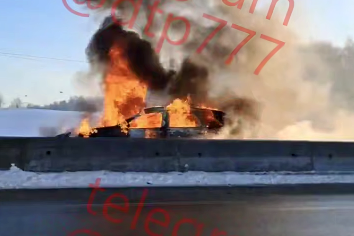 На размещенных в сети кадрах видно, что на проезжей части горит машина, при этом пламя охватило транспорт полностью. Далее на записи заметно, что на место прибыли экстренные службы, которые ликвидируют возгорание.
