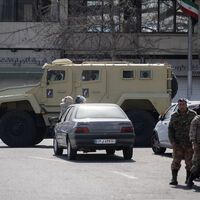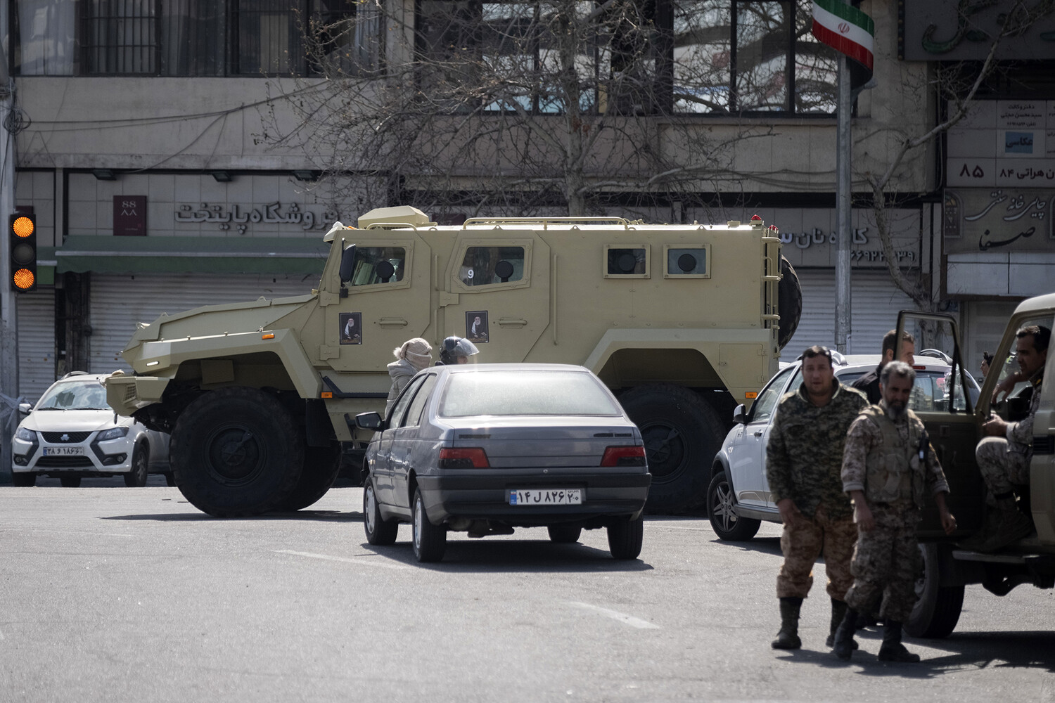 Издание прикрепило фотографию из базы американского фотоагентства Getty Images, которая была сделана в Тегеране. На снимке видно выезжающий на перекресток бронеавтомобиль «Спартак» песочного цвета, который перекрыл дорогу другой машине. На дверях автомобиля можно заметить снимки бывшего верховного лидера Ирана Али Хаменеи, ликвидированного во время американо-израильского удара. Также в кадр попало несколько людей в военной форме, стоящих у открытой двери автомобиля.